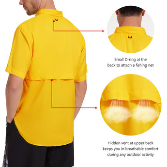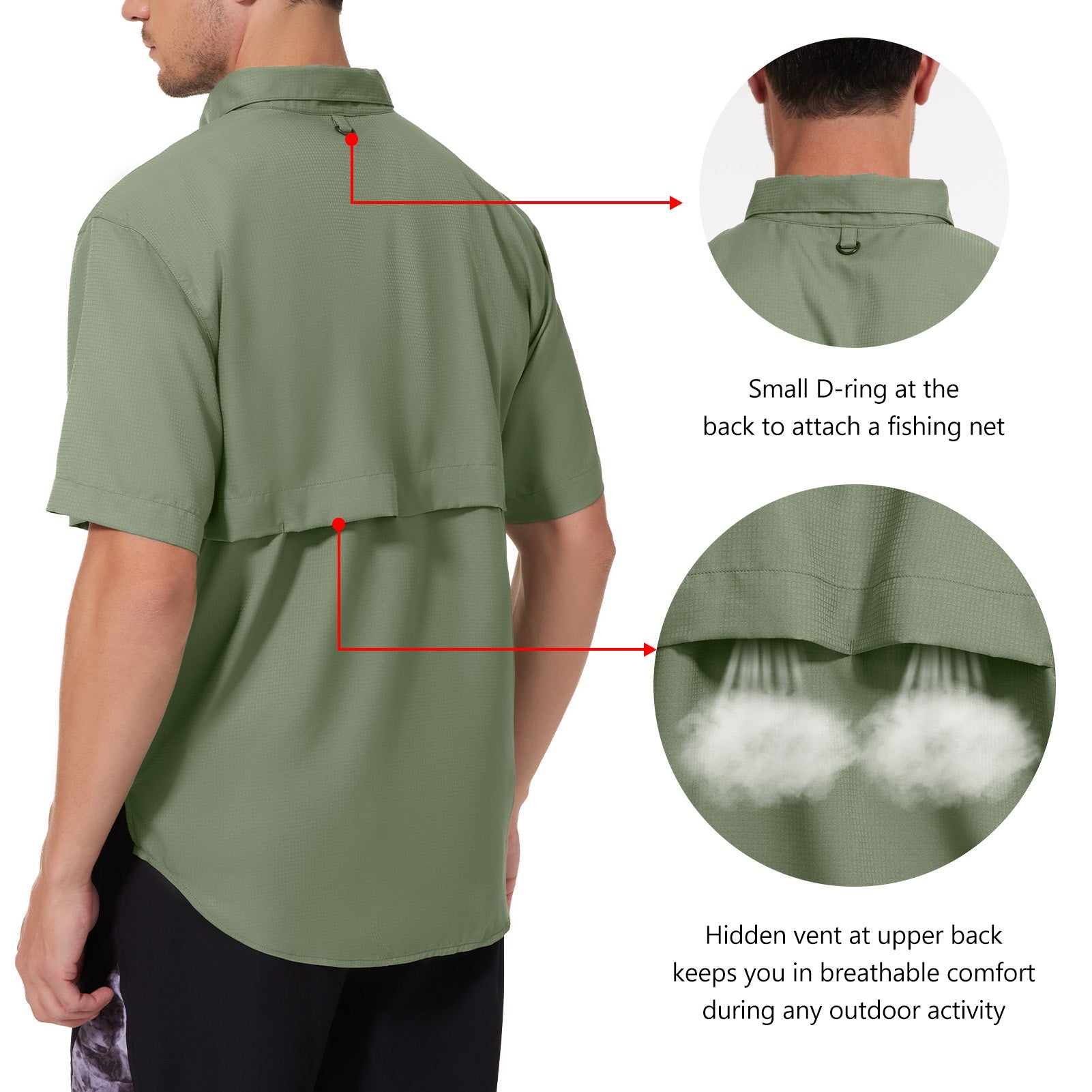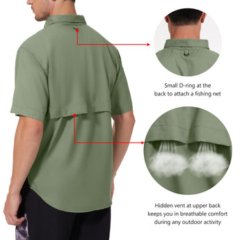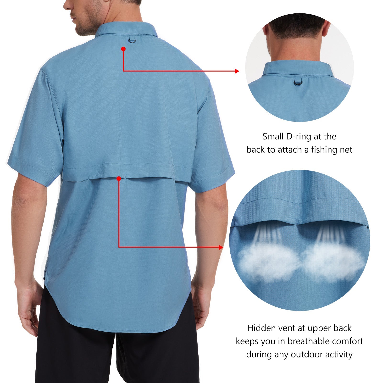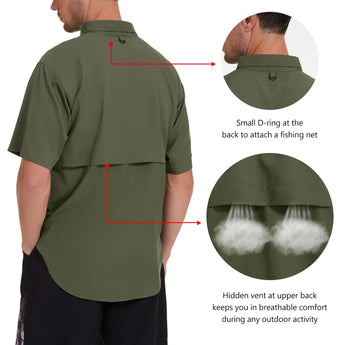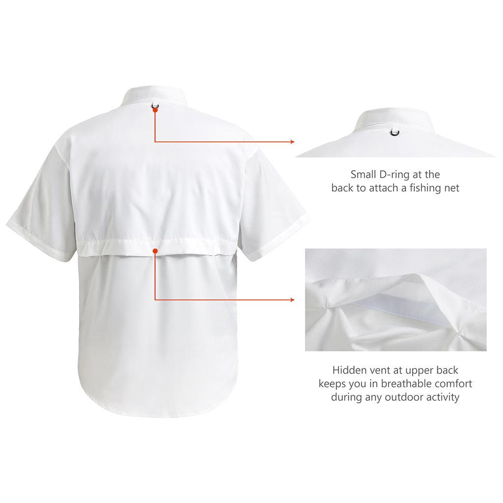 • No scratchy tag construction for chafe-free comfort; A small D ring at the back to hang the shirt and it can also attach a fishing net; A wiping cloth inside the bottom hem solves your foggy-eyeglass problem