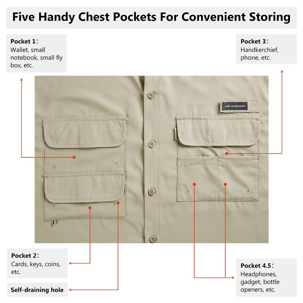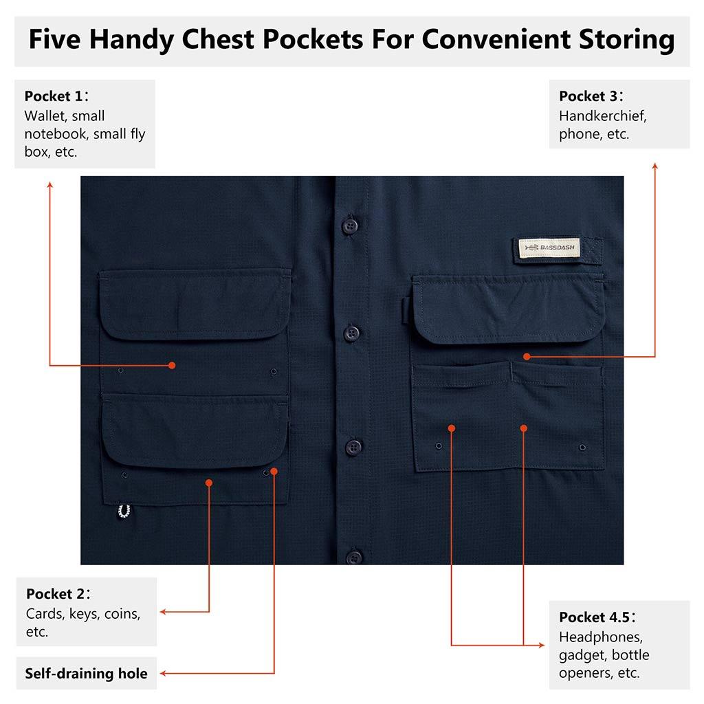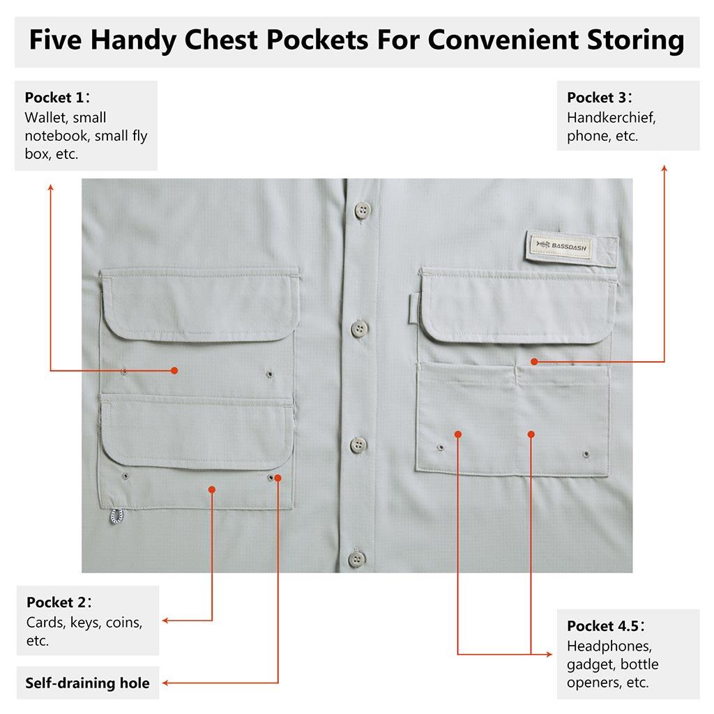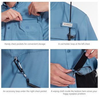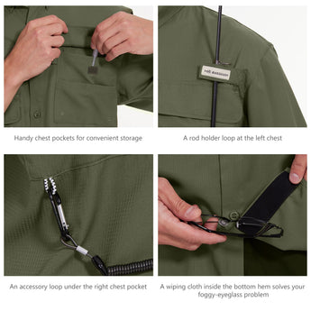 • Handy feature design - five chest pockets with hook-and-loop closure for convenient storing; A rod holder loop at the left chest; A Glasses or Pen loop; An accessory loop under the right chest pocket. These performance designs can well keep your essentials at the ready and free up your hands