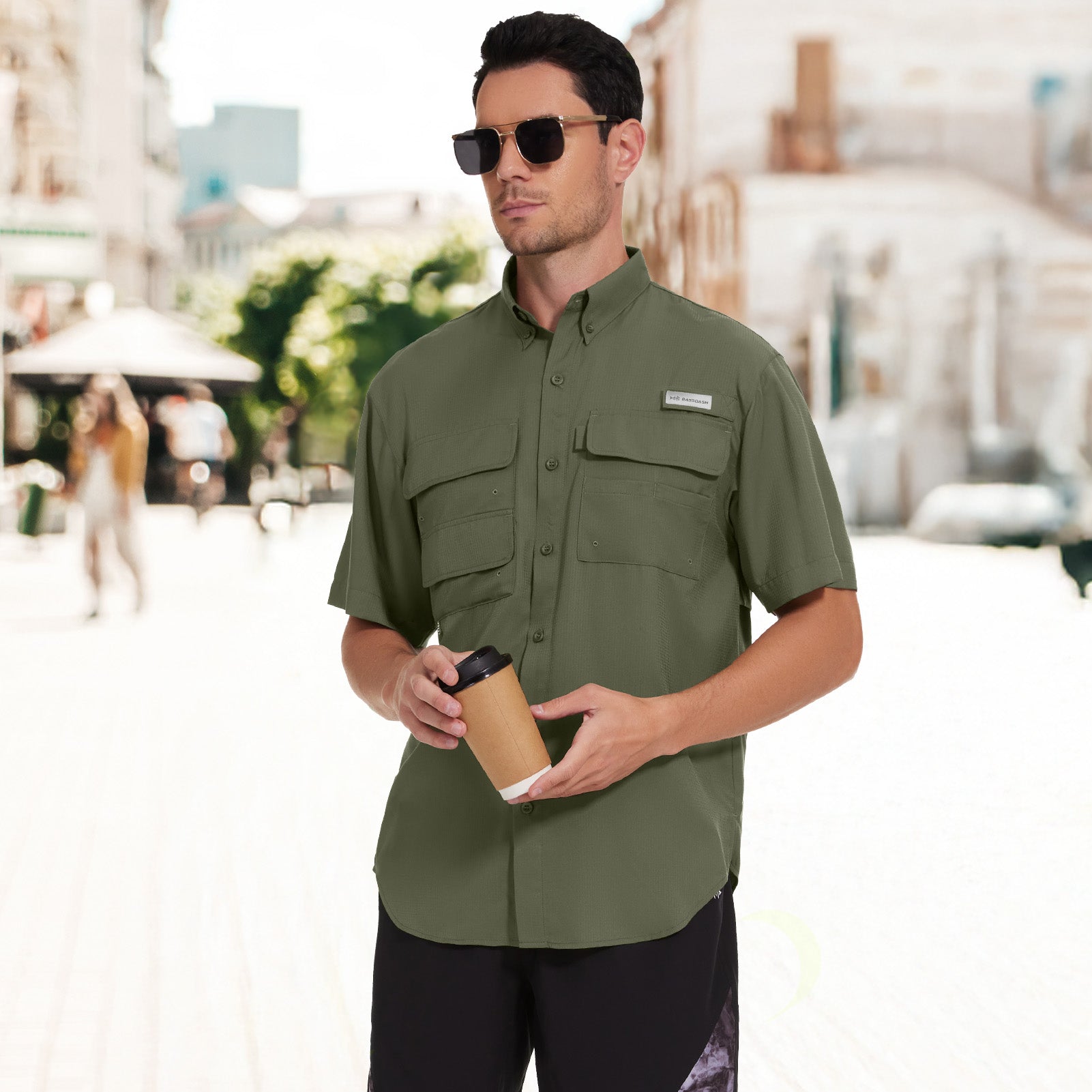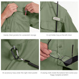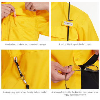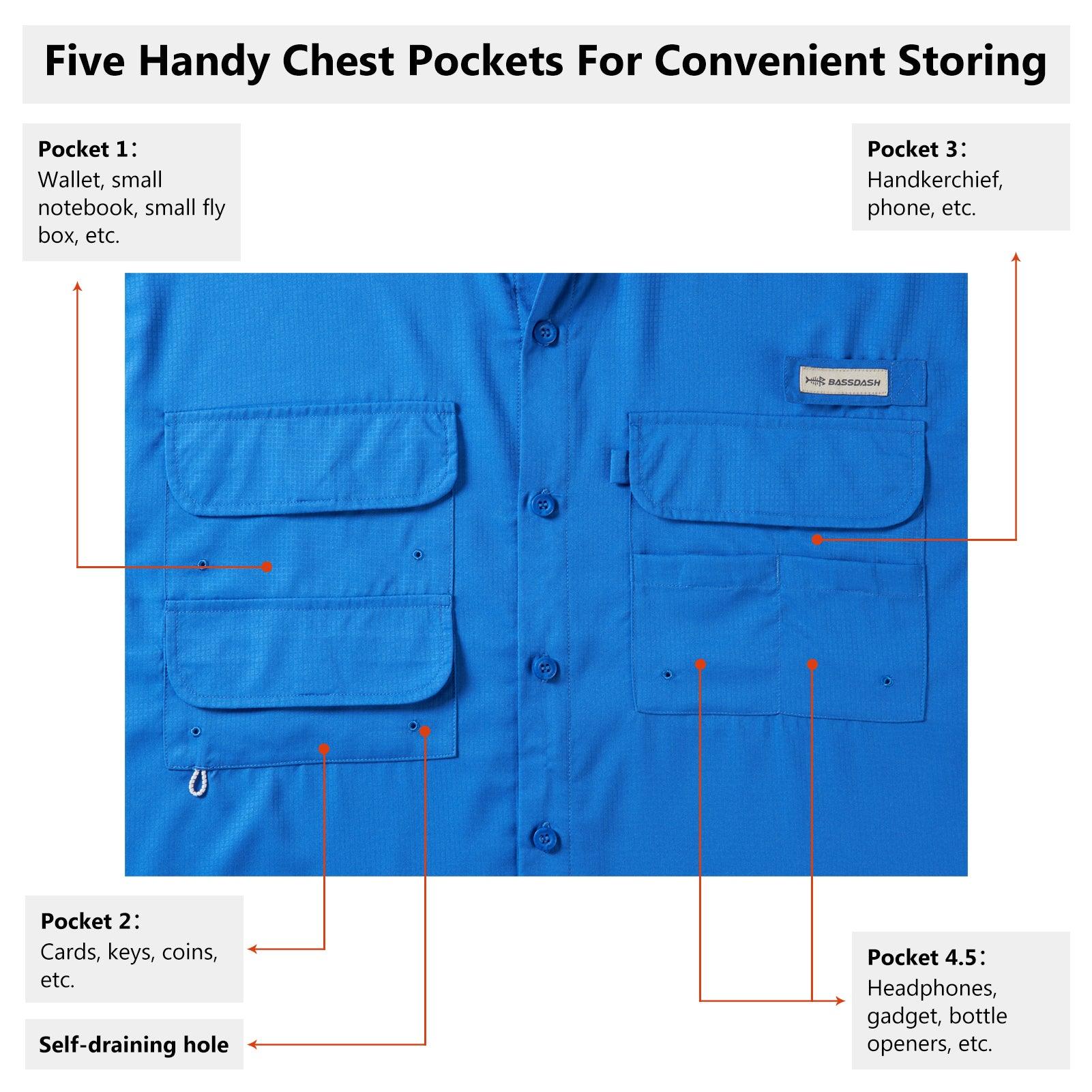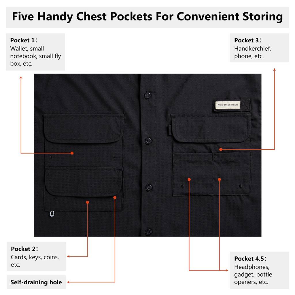 • Handy feature design - five chest pockets with hook-and-loop closure for convenient storing; A rod holder loop at the left chest; A Glasses or Pen loop; An accessory loop under the right chest pocket. These performance designs can well keep your essentials at the ready and free up your hands