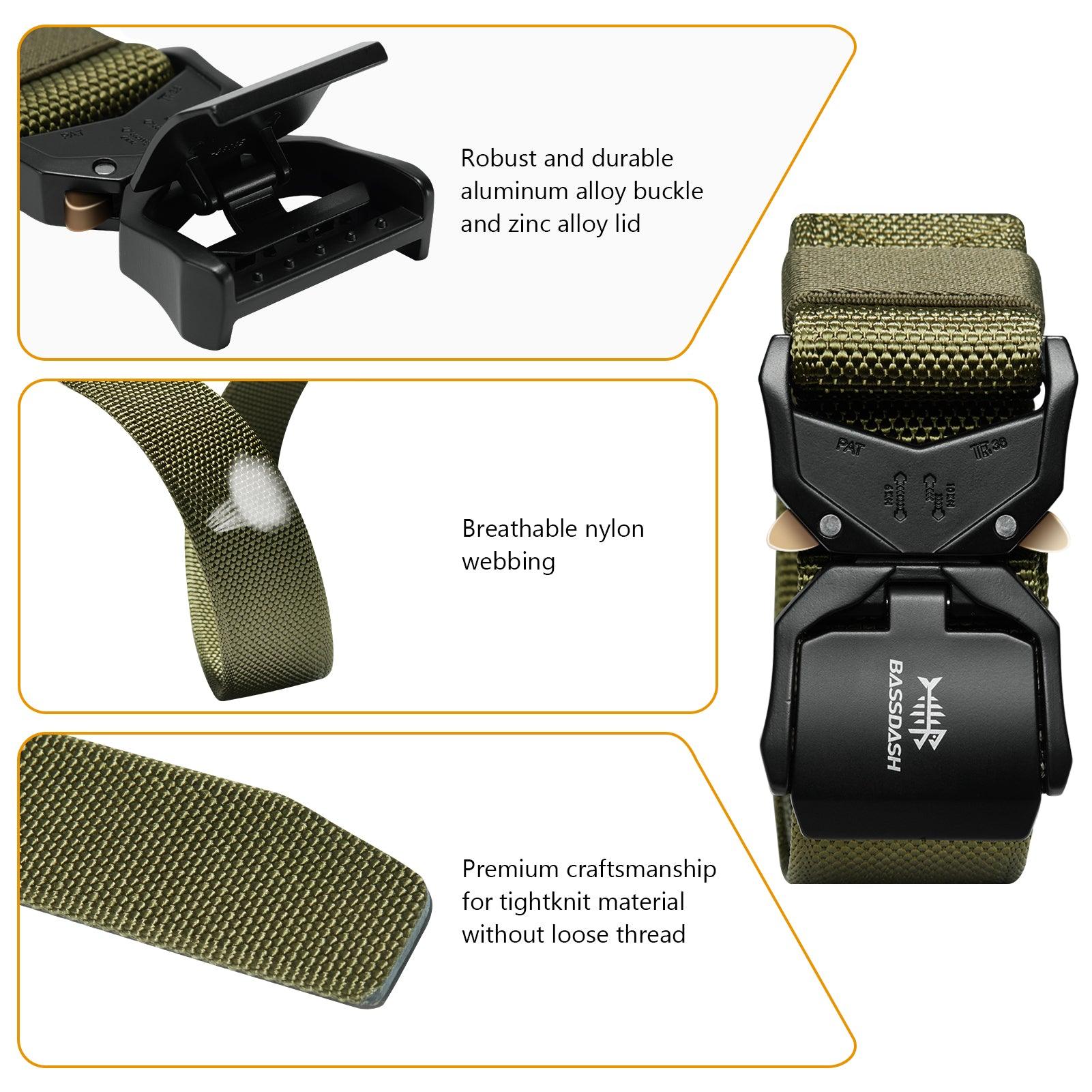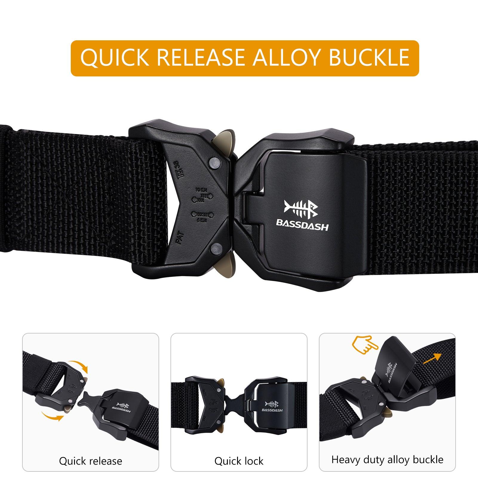 • Quick release functionality - the belt buckle will release when you push the two golden tabs at the same time; The buckle will remain locked if only one of the two tabs is pressed; Once tightened, the belt will stay firmly in place and will not slip.