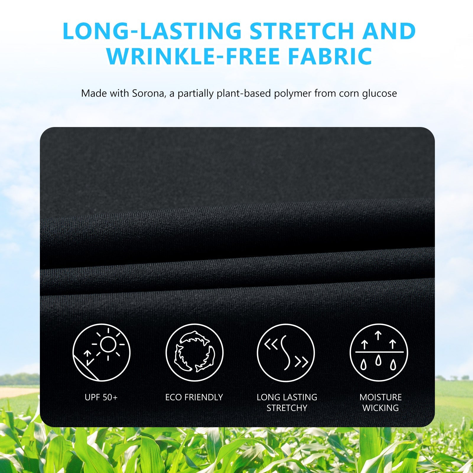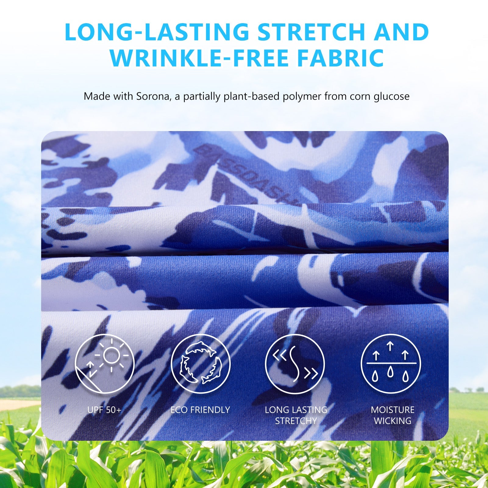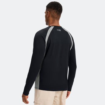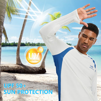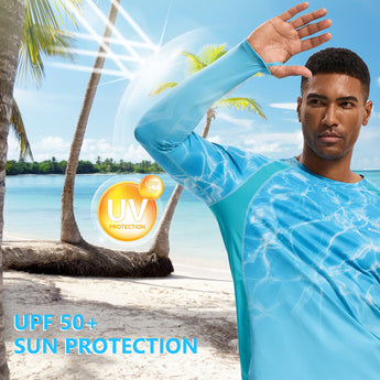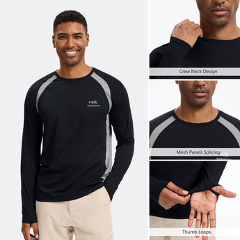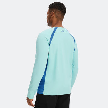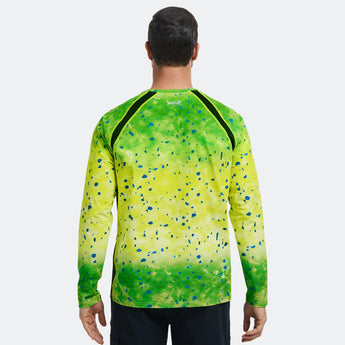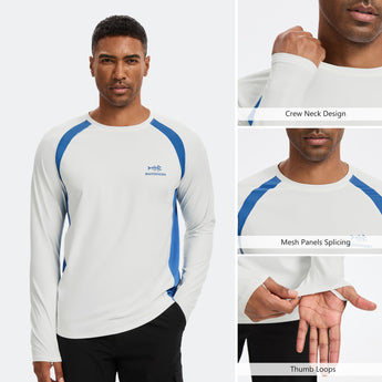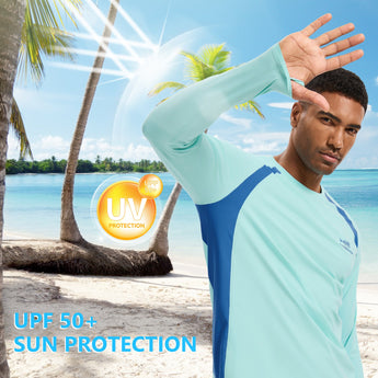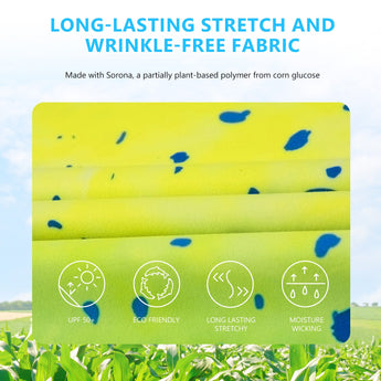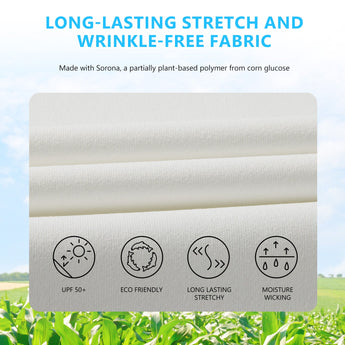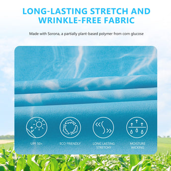 This eco-friendly long sleeve sun shirt is crafted with a blend of 53% plant-based Sorona polyester and 47% polyester, offering long-lasting stretch and shape retention. Featuring UPF 50+ sun protection and breathable mesh side splices, and thumb loops, the performance shirts are perfect for outdoor activities and daily wear.