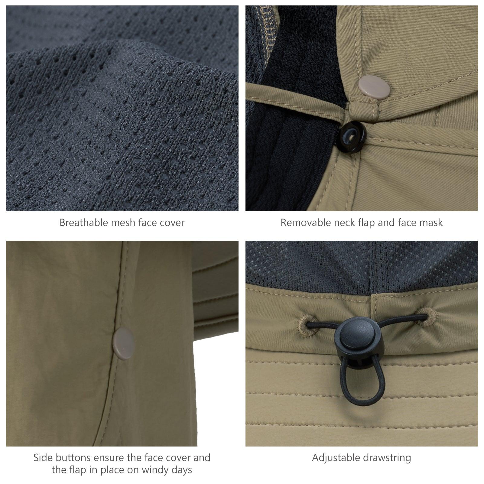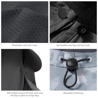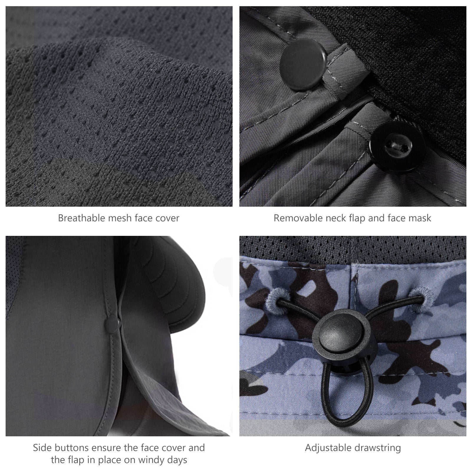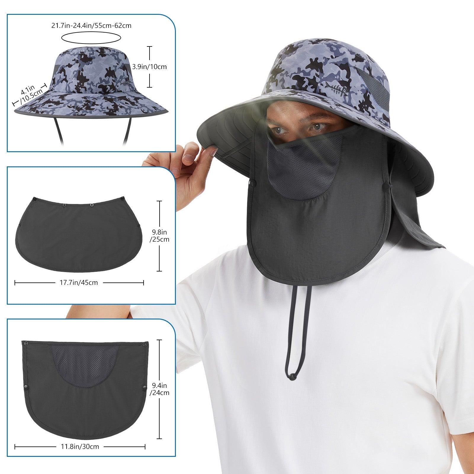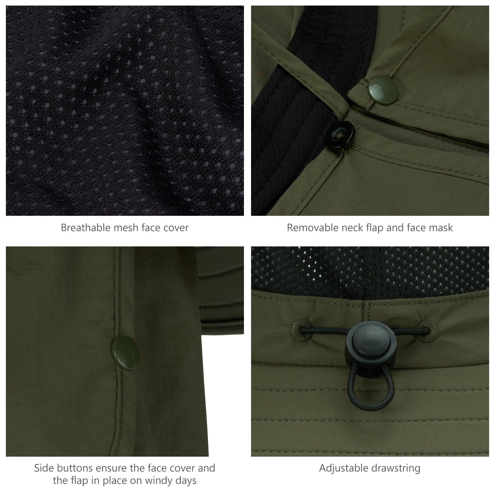 • Features wide brim, and removable face cover & neck flap to protect you against harmful UV rays from different angles and offer 360-degree sun protection for your face, ears and neck; The face cover and neck flap are detachable to provide multiple wearing ways to fit your different needs.