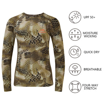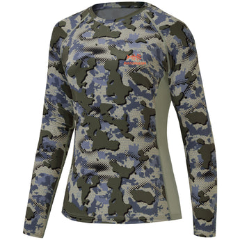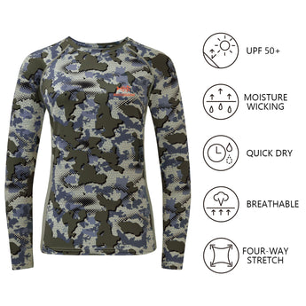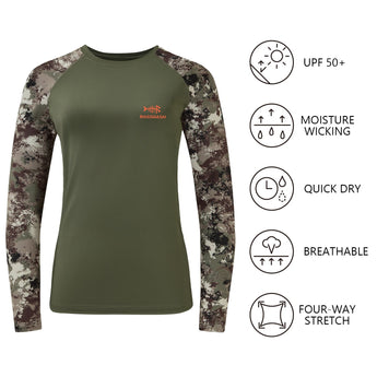 • This long sleeve camo shirt in a feminine cut is a must for ladies¡¯ hunting adventure; The 4-way stretch material and raglan sleeve design improve the flexibility to provide more freedom of movement; The mesh panels on either side of the shirt allow more air flow.