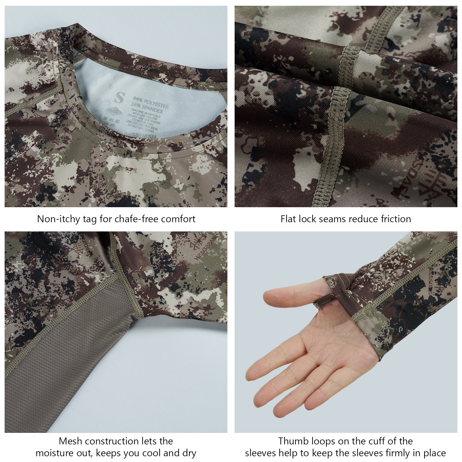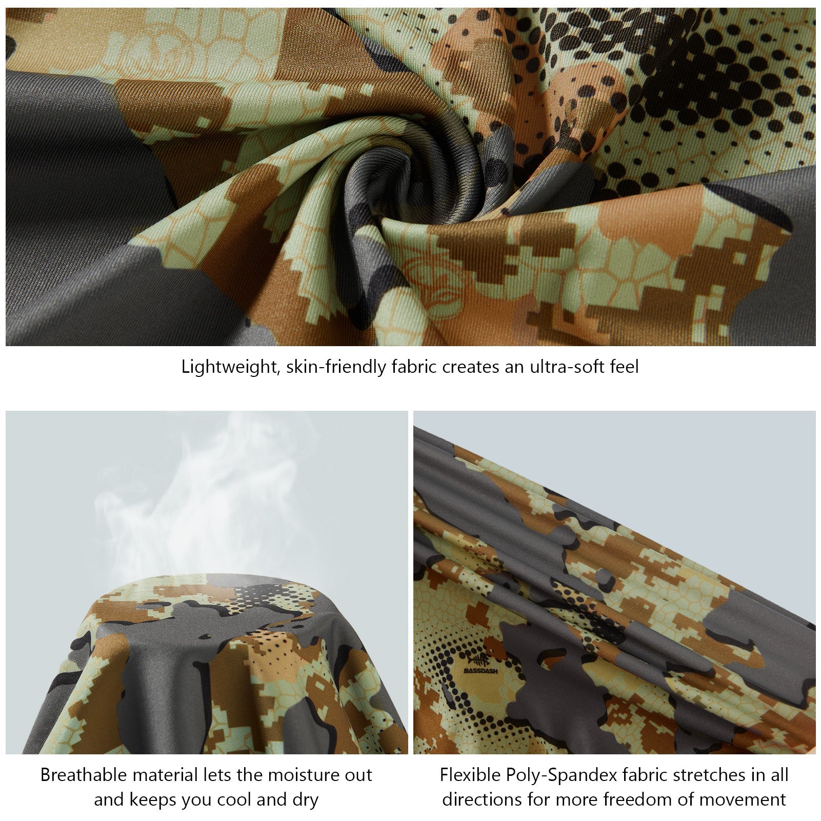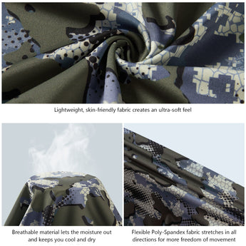 • Bassdash patented Highland Camouflage patterns designed with a focus on animal vision; Breaking the mold by using a digitally rendered blend of micro details for close-range concealment, this Highland camo works effectively across a wide range of vegetation and terrains - it is a highly versatile camouflage for most conditions.
