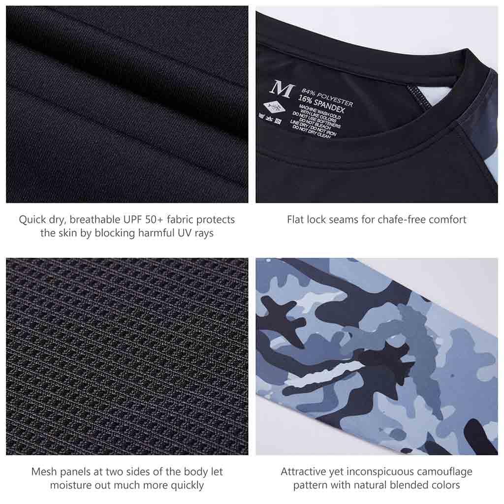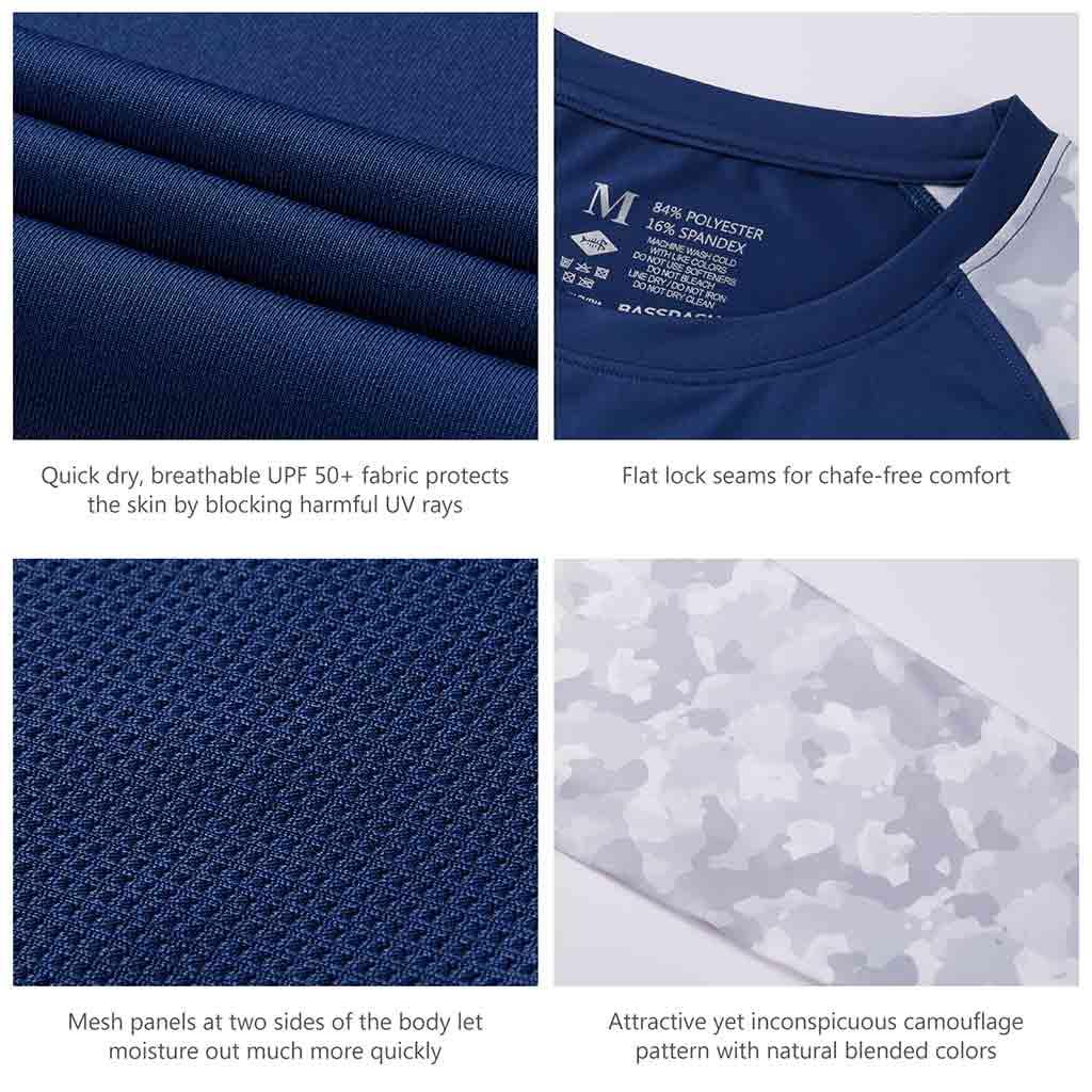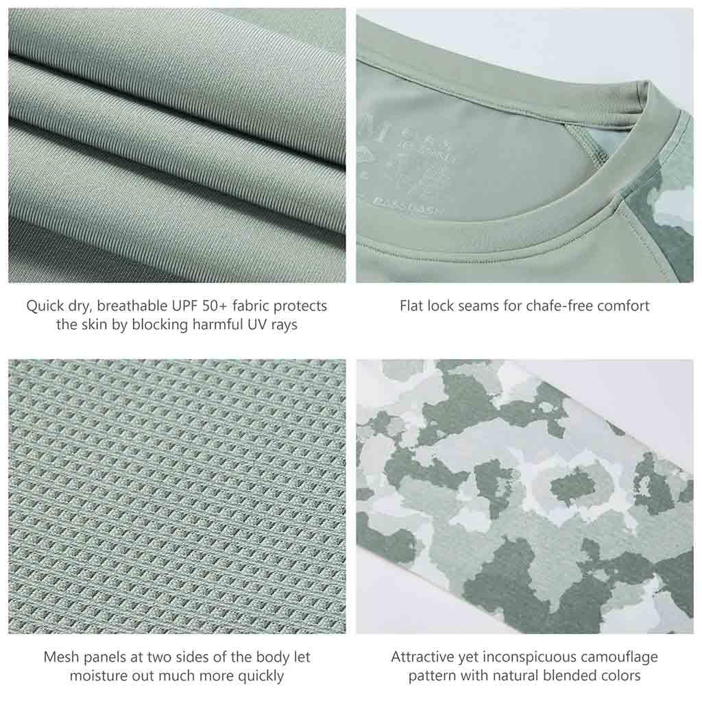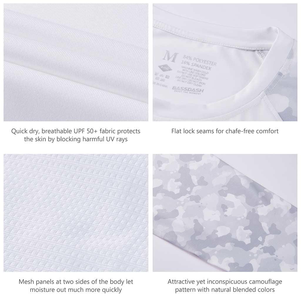 Bassdash UPF 50+ Camo Fishing Shirts are made from breathable, advanced Knitted UV protection 84% polyester, 16% spandex fabric. No pilling, no shrinkage. Perfect for all types of outdoor activities like fishing, kayaking, hiking, motorcycling, biking, trekking, hunting and more.
