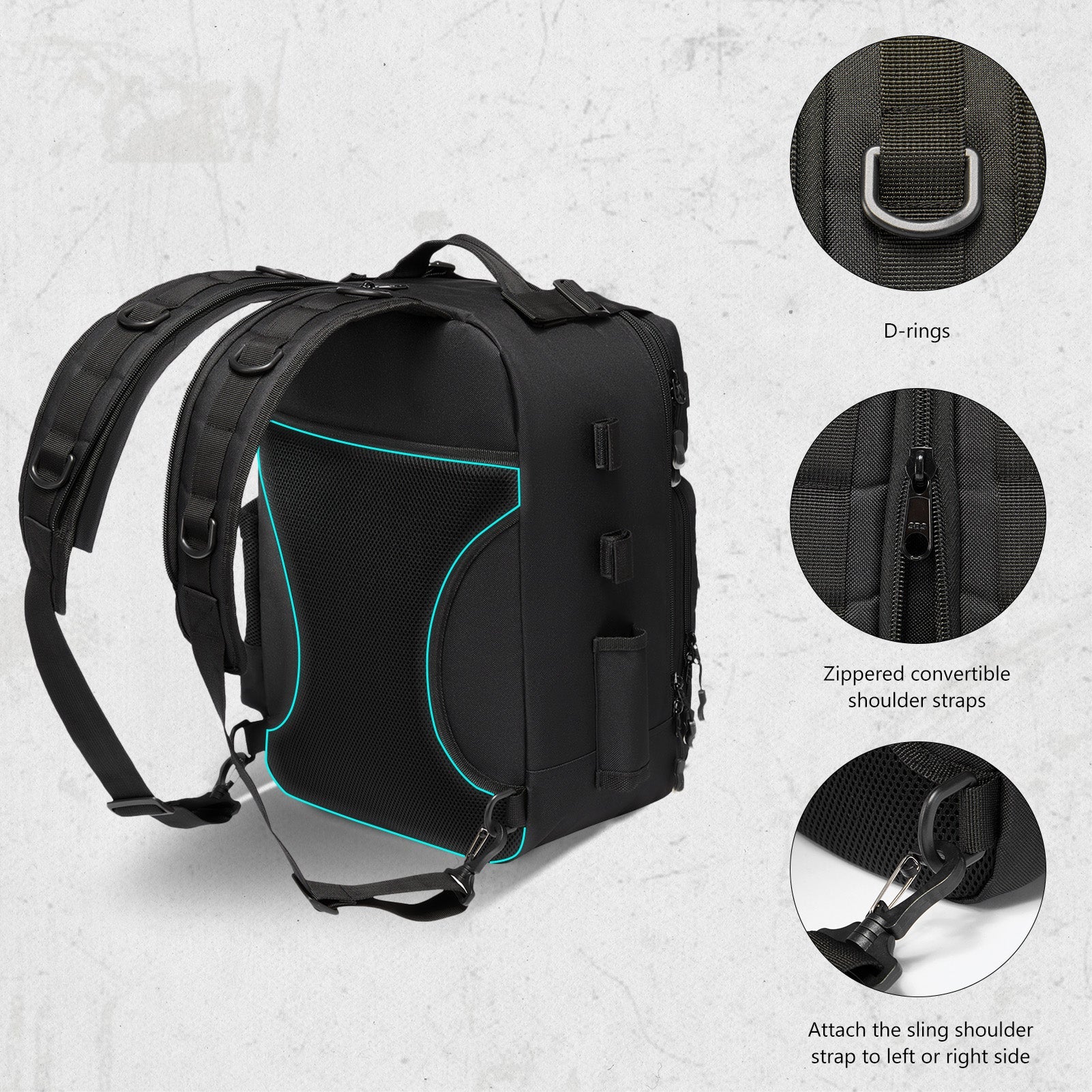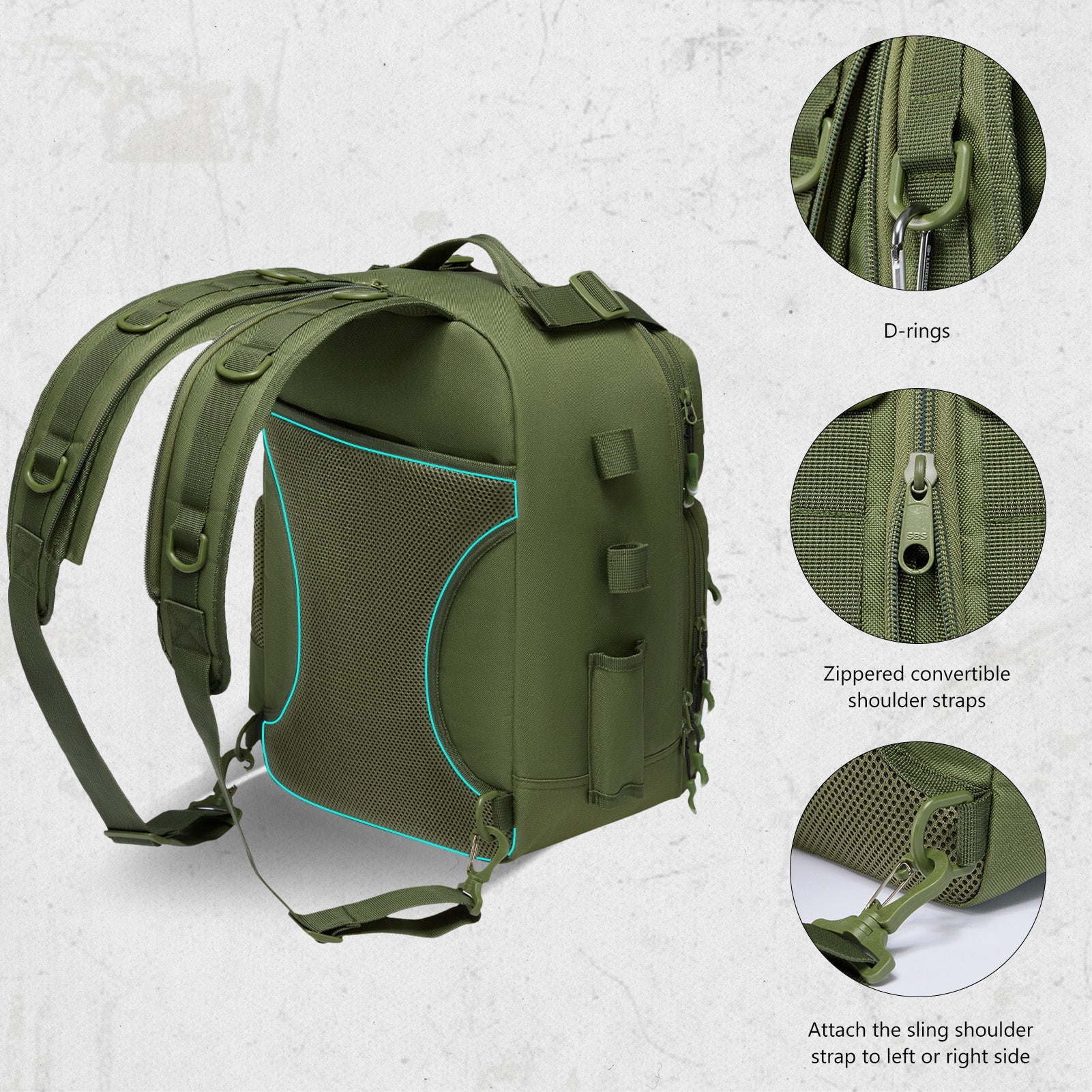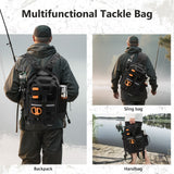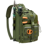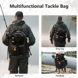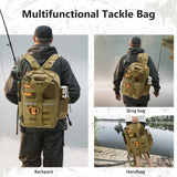 Engineered for serious anglers, this 600D rip-stop polyester fishing backpack with rod holder features water-resistant PVC coating for all-weather durability. Its convertible strap system transforms seamlessly between backpack, sling, chest, or shoulder bag modes for optimal mobility.