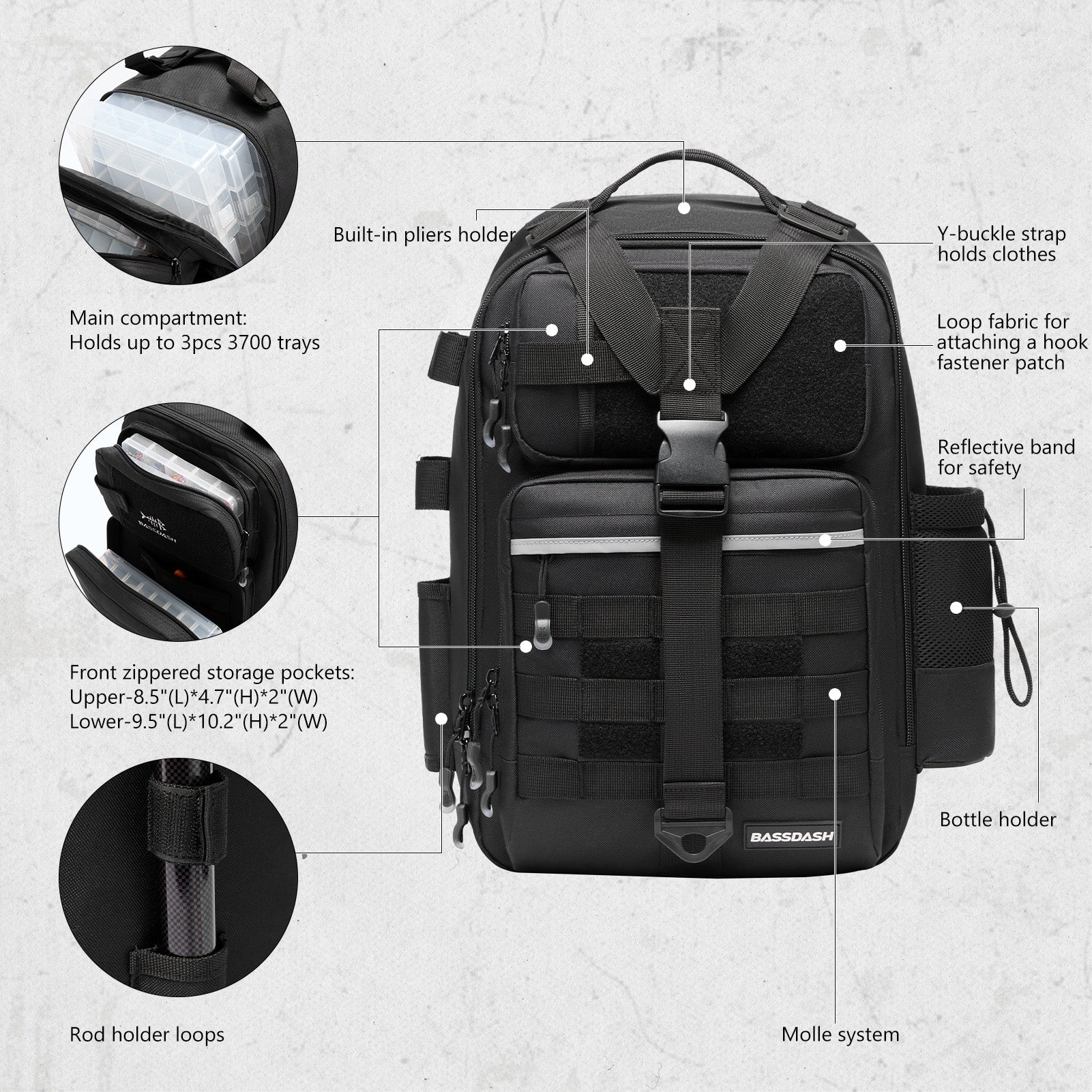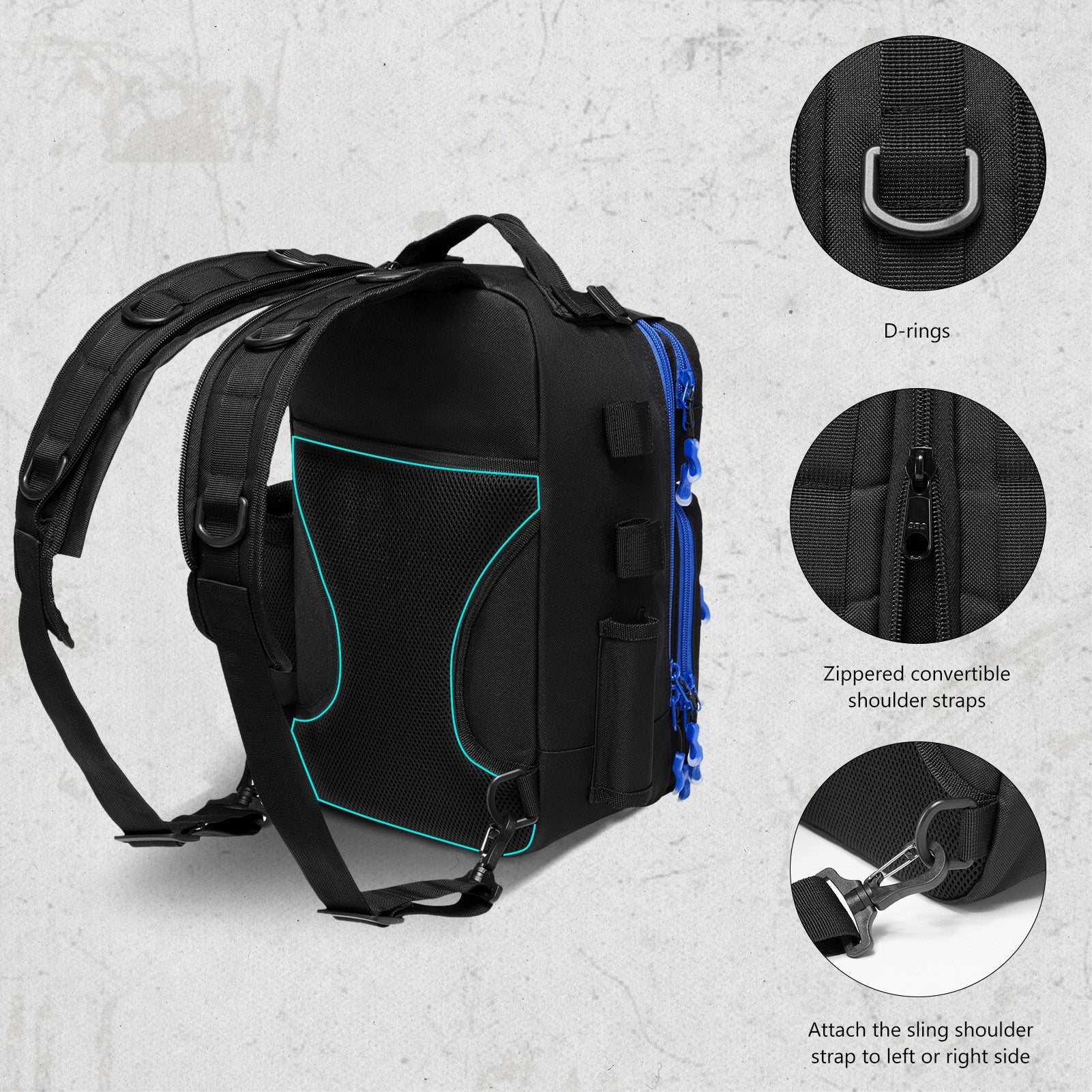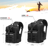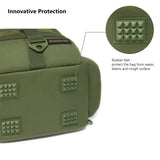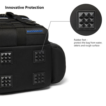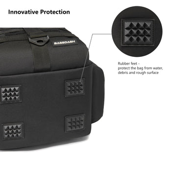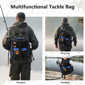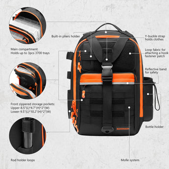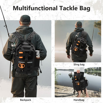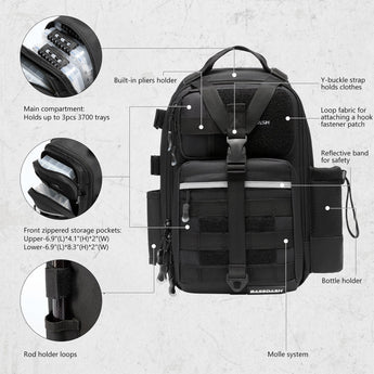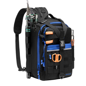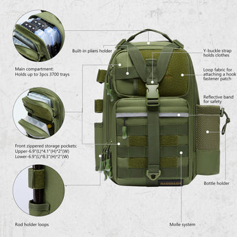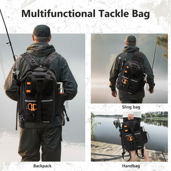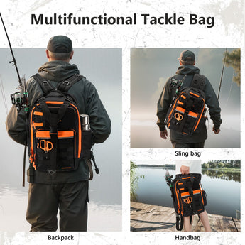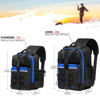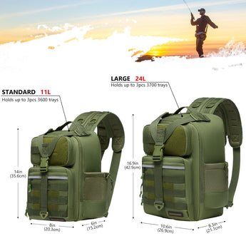 Available in two sizes: The large bag (16.9"x10.6"x8.3") can hold up to 3 large 3700-size utility boxes, while the standard bag (14"x8"x6") can hold up to 3 large 3600-size utility boxes. Both versions feature three front pockets, multiple inner compartments, and a back pocket for organization. They are convertible and adjustable, with zippered straps that allow them to be used as a sling, a backpack, a chest bag, a shoulder bag, or a handbag. The water-resistant shell, along with an added PVC coating, protects your gear from moisture. Additional features include a reflective band for safety, a Molle system, quick-release Y-buckle strap, rod holders, a side bottle pocket, an ergonomic padded mesh back, D-rings, non-slip silicone feet and SBS zippers.