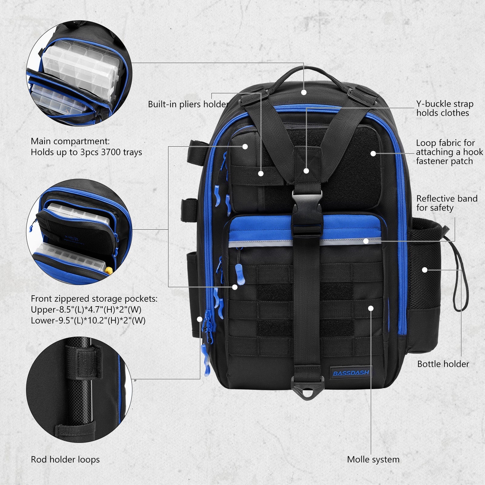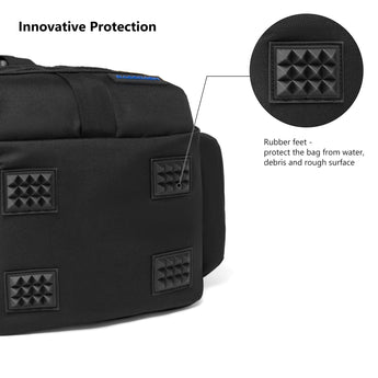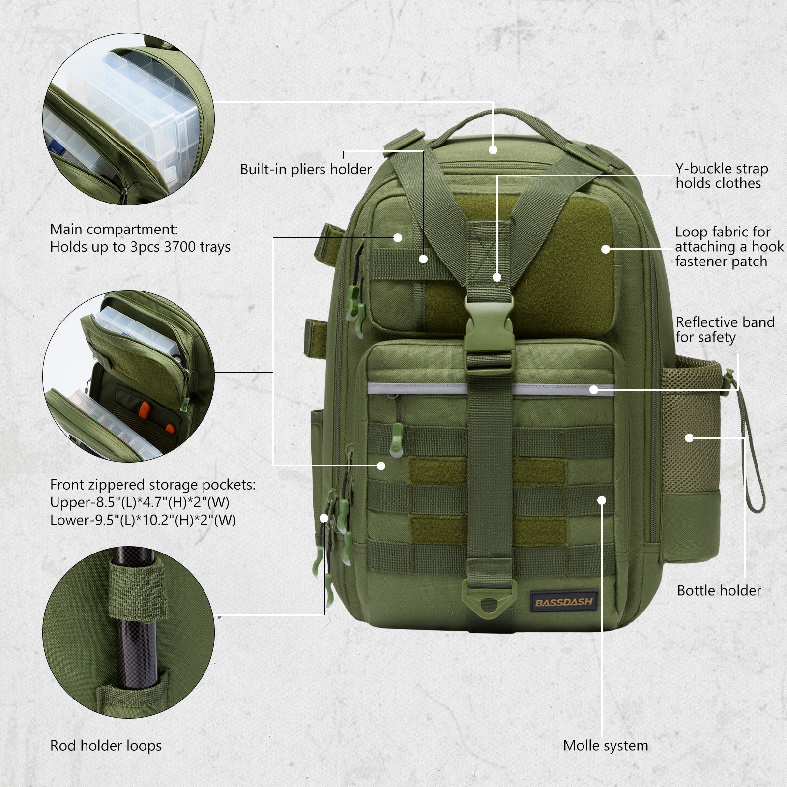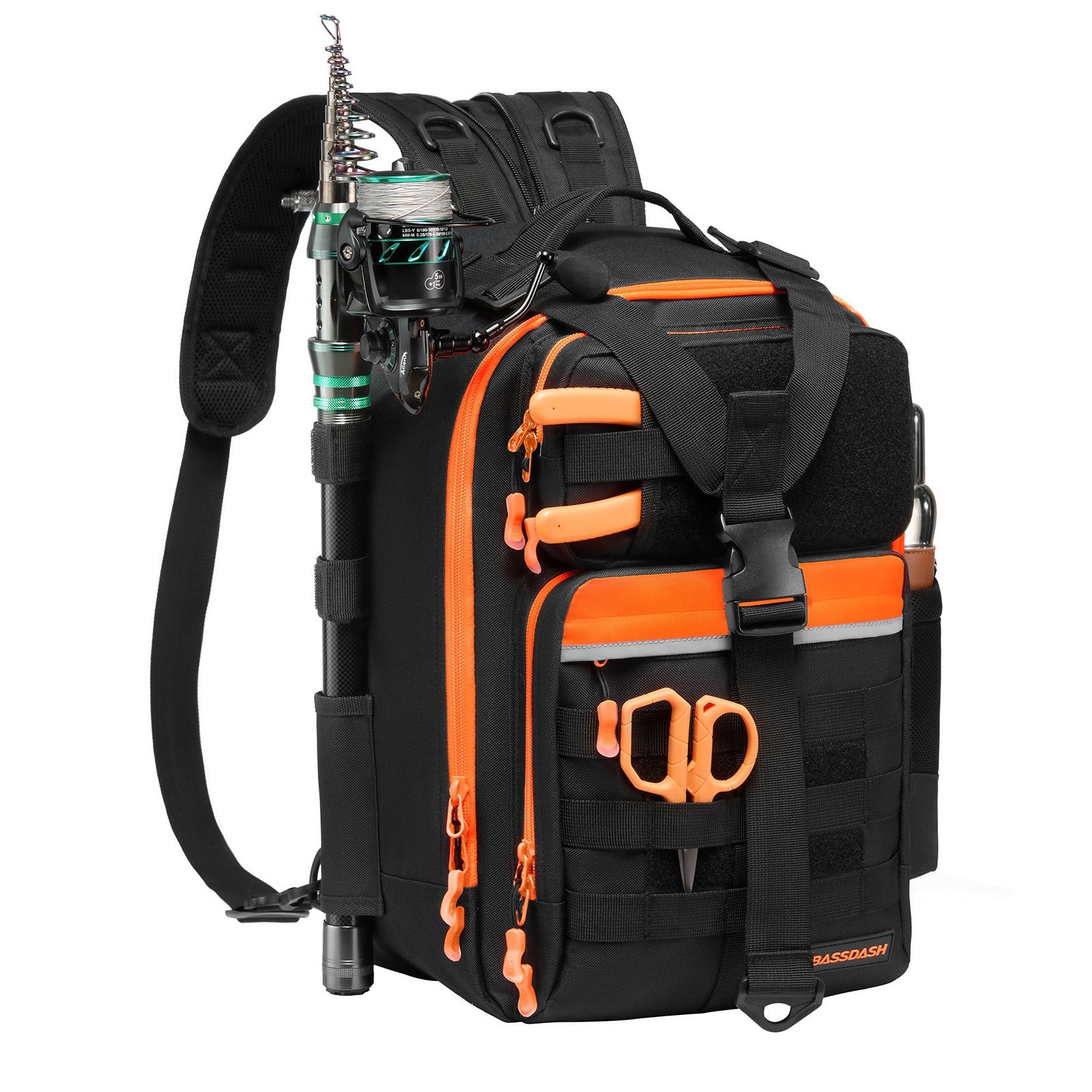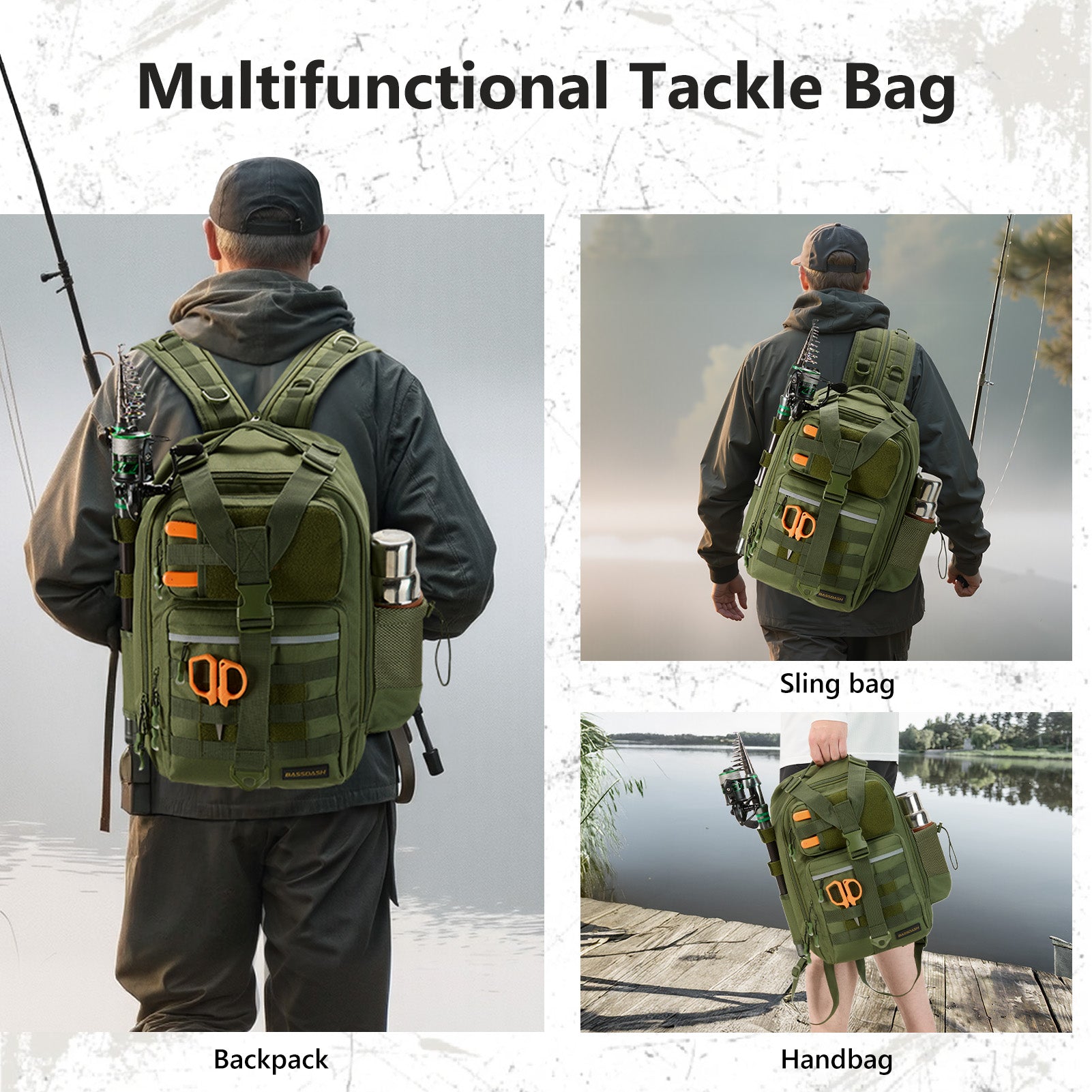 Available in two sizes: The large bag (16.9"x10.6"x8.3") can hold up to 3 large 3700-size utility boxes, while the standard bag (14"x8"x6") can hold up to 3 large 3600-size utility boxes. Both versions feature three front pockets, multiple inner compartments, and a back pocket for organization. They are convertible and adjustable, with zippered straps that allow them to be used as a sling, a backpack, a chest bag, a shoulder bag, or a handbag. The water-resistant shell, along with an added PVC coating, protects your gear from moisture. Additional features include a reflective band for safety, a Molle system, quick-release Y-buckle strap, rod holders, a side bottle pocket, an ergonomic padded mesh back, D-rings, non-slip silicone feet and SBS zippers.