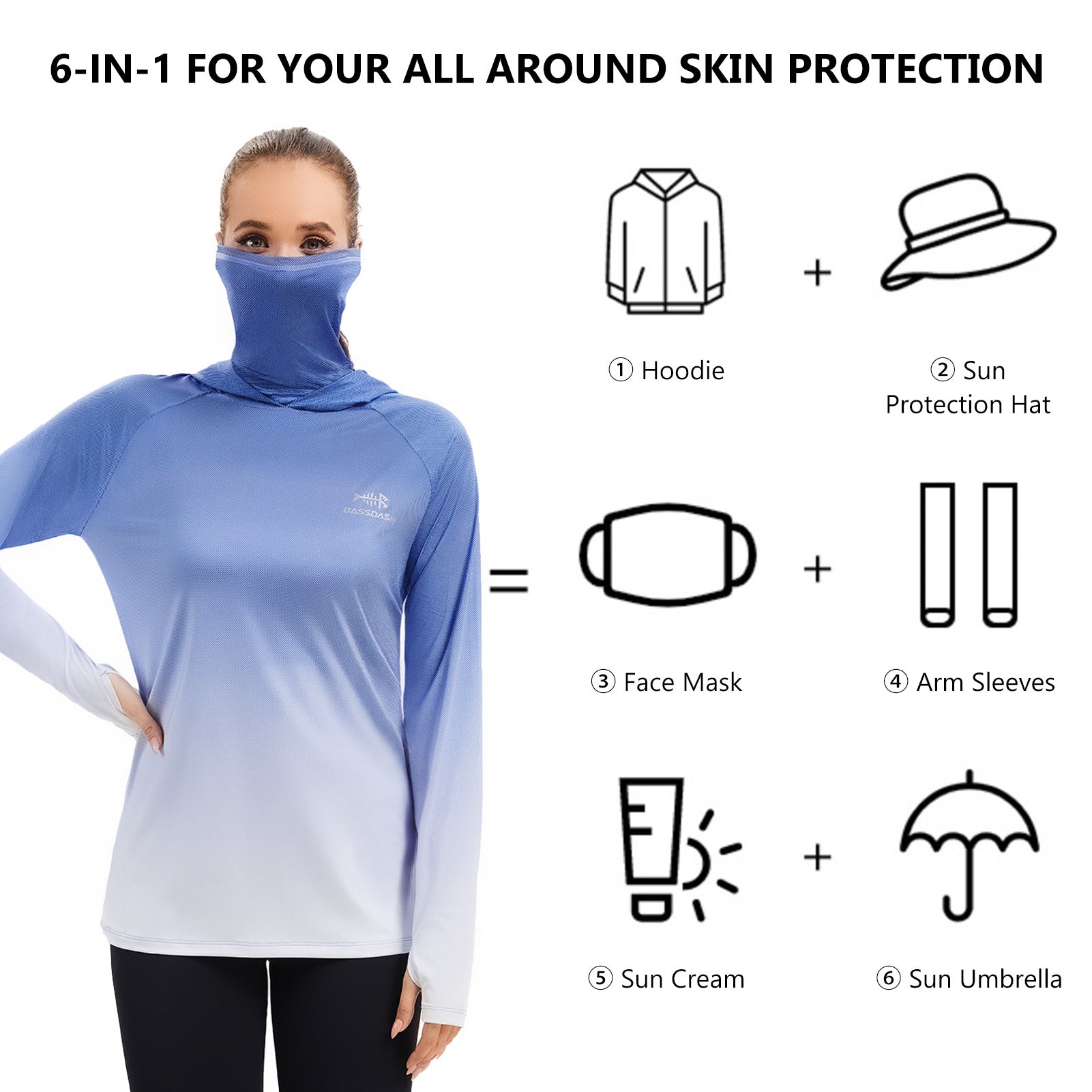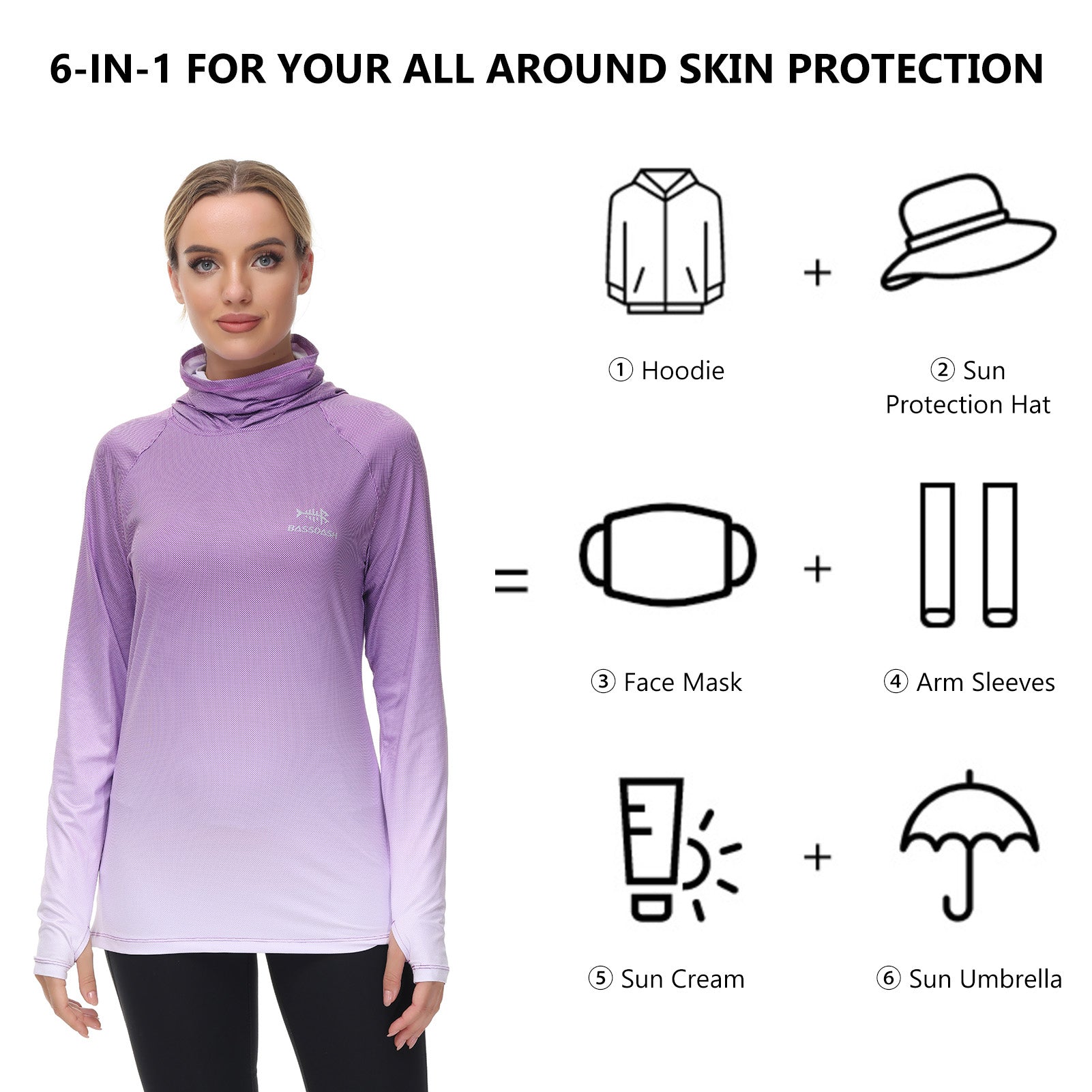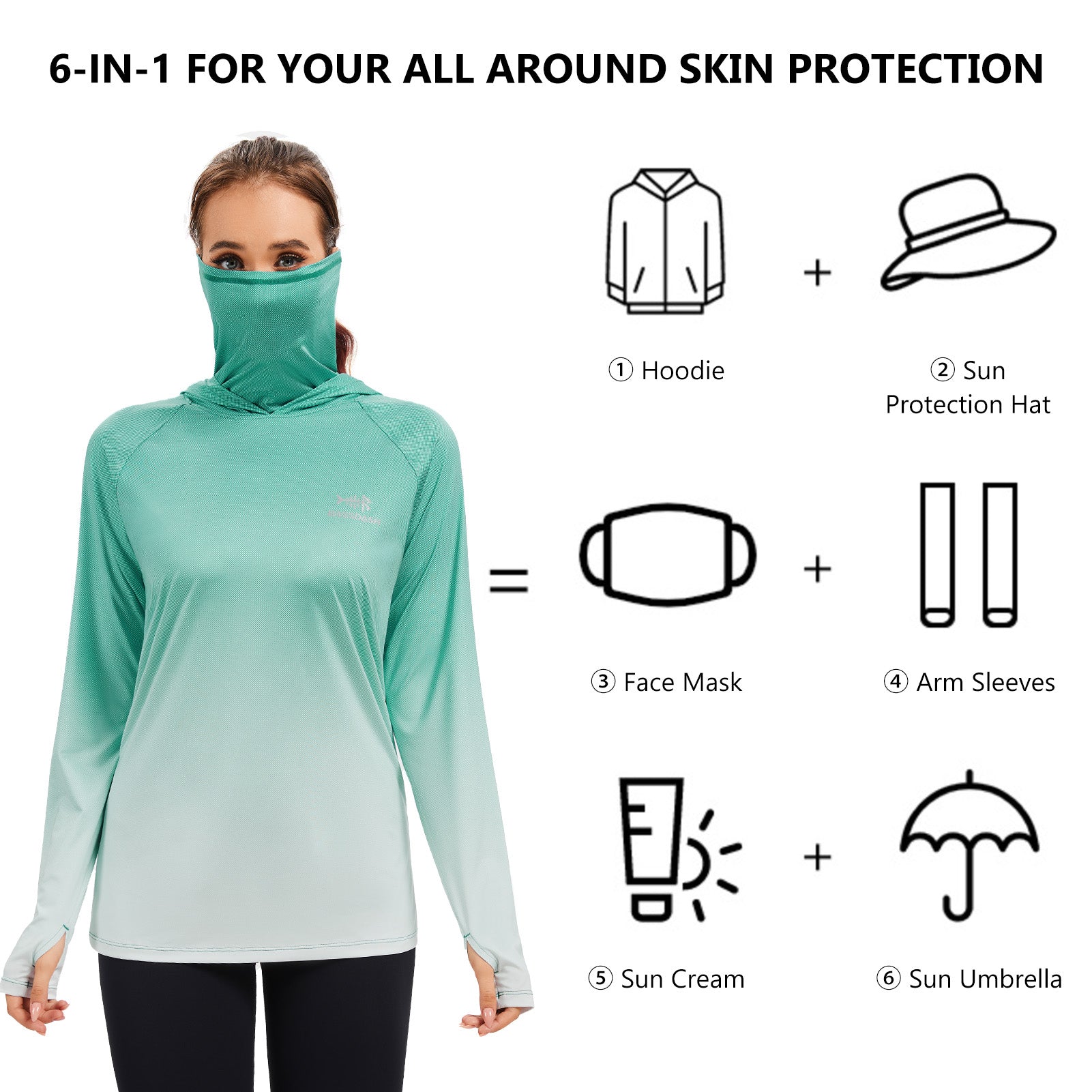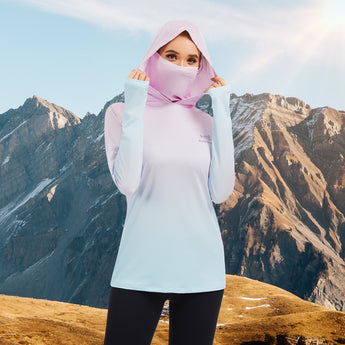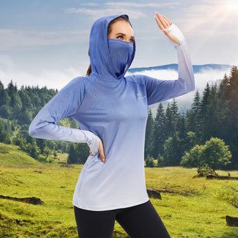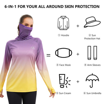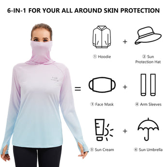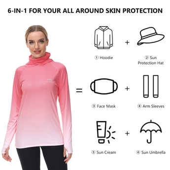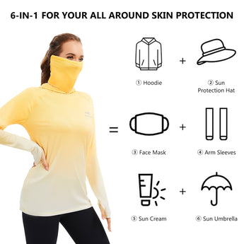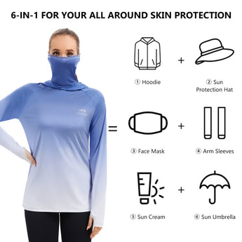 - UPF 50+ technical material protects your skin from harmful UVA and UVB rays; Long sleeve hoodie with super breathable face cover is specifically designed to provide greater sun protection, help you enjoy the sunlight more safely so you can stay outside as long as you like