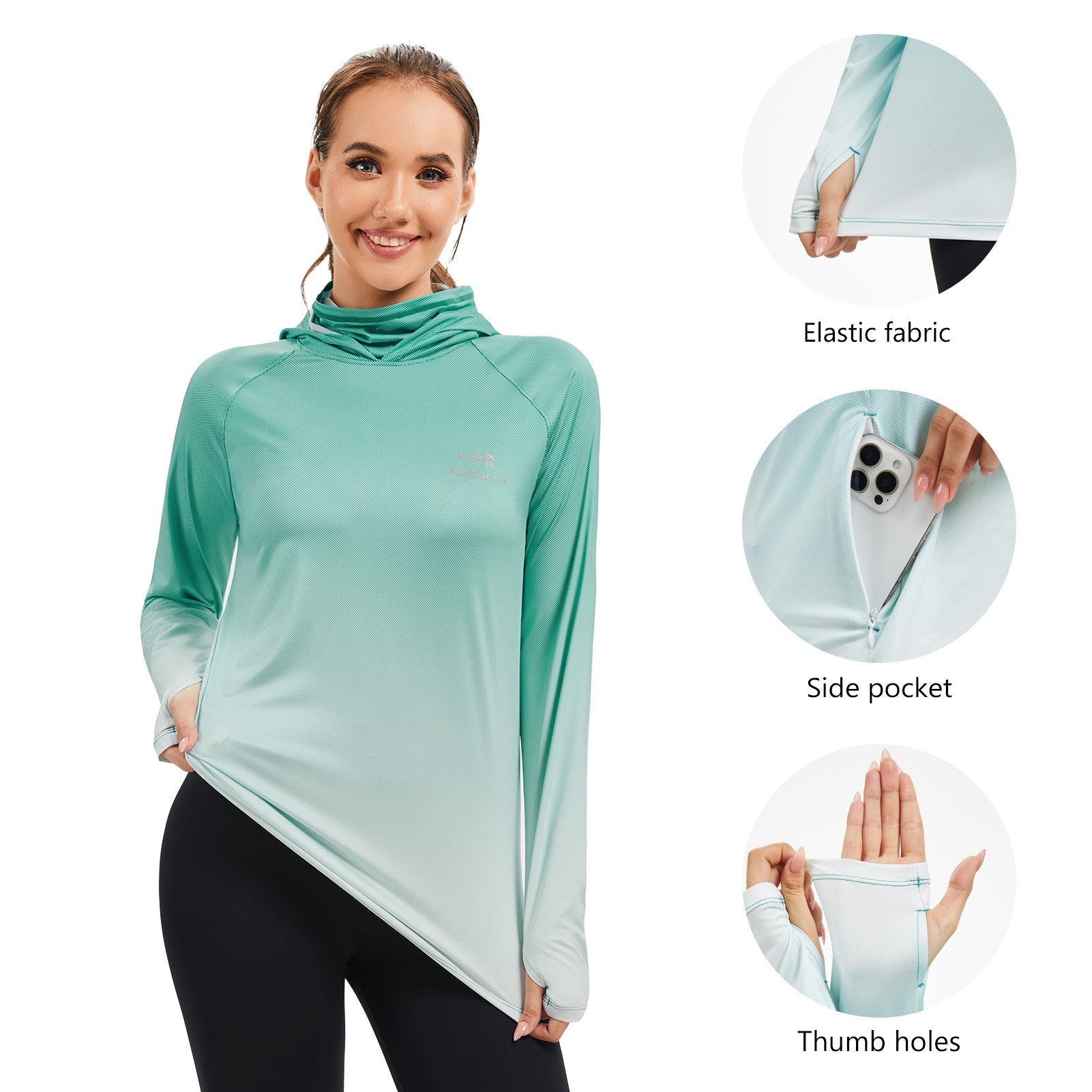 Advanced breathable, light-reflecting fabric pulls moisture away rapidly and keeps you active dry. The hole added to the hood frees your ponytail.
