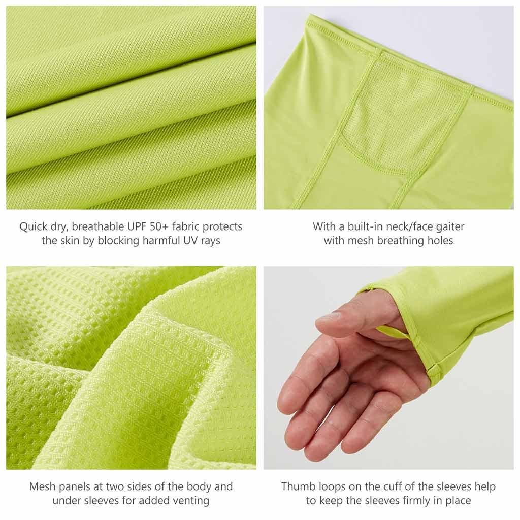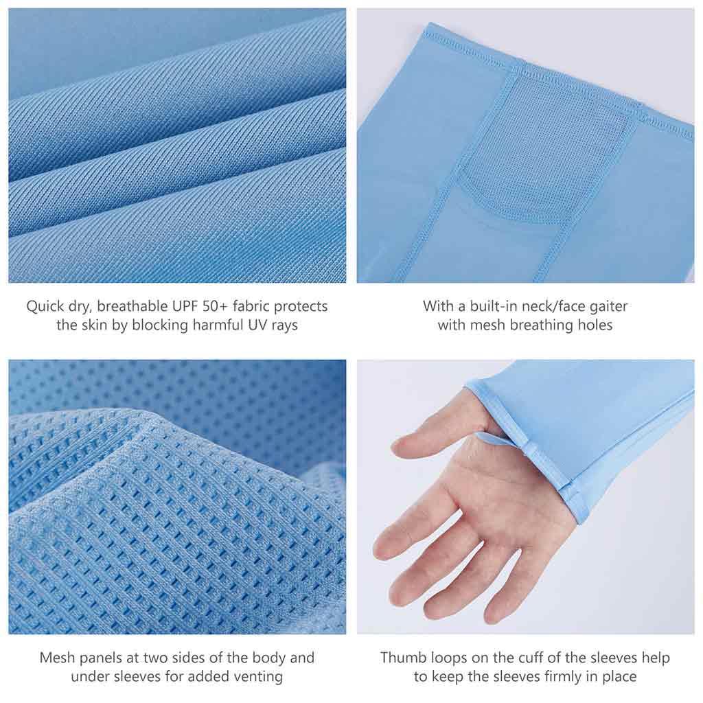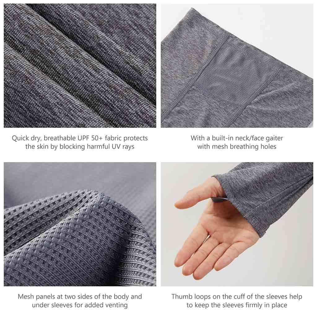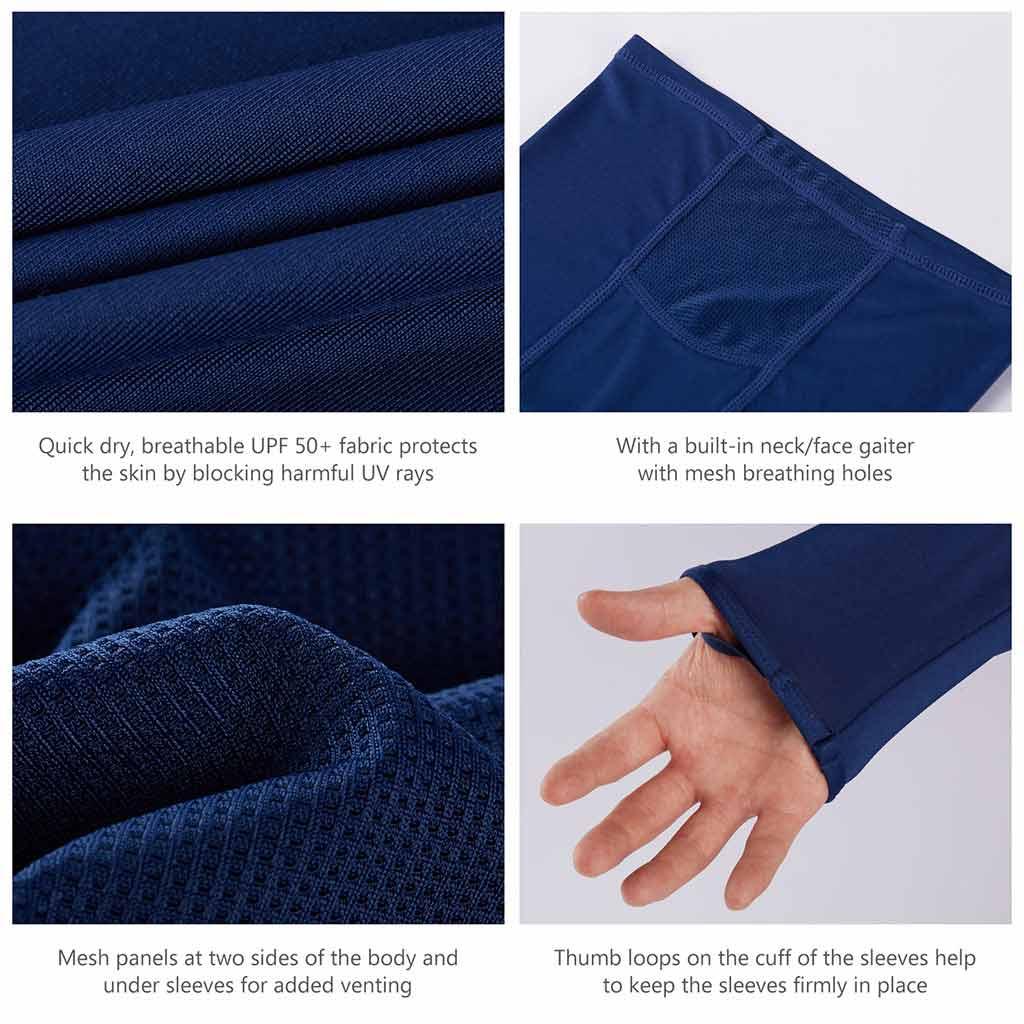 - With a built-in hood and neck gaiter - the neck gaiter can be worn as a mask and it is soft and breathable, enhanced with mesh breathing holes to help keep your sunglasses clear without fogging up; Fully protects your face and neck from the harsh sun rays, wind, dust and bugs all day long and also helps keep your head, face and neck warm while in cold days