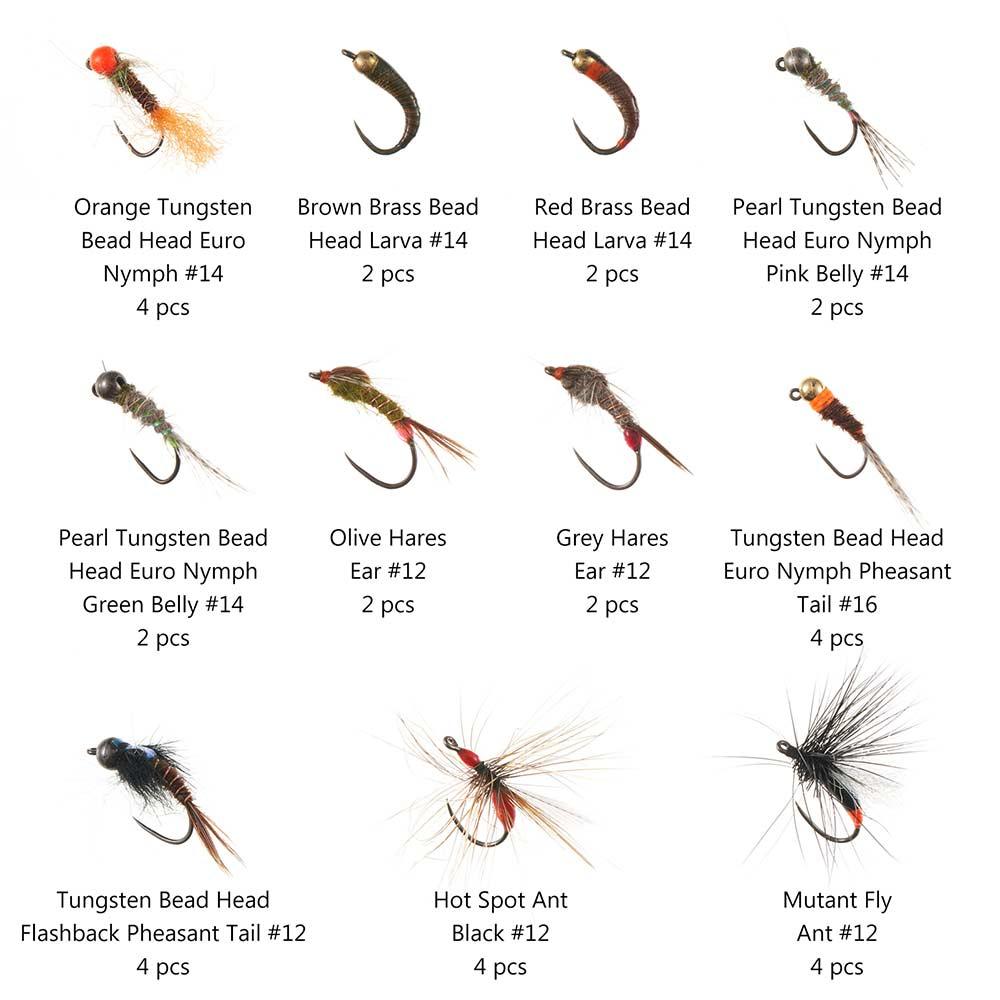 • The 32 flies in 11 patterns in this collection include: Tungsten Bead Head Euro Nymph in Orange and Pearl, Brass Bead Head Larva in two color patterns, Hares Ear in two color patterns, Tungsten Bead Head Euro Nymph Pheasant Tail, Tungsten Bead Head Flashback Pheasant Tail, Hot Spot Ant Black, Mutant Fly Ant