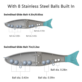 • With eight stainless steel balls (ball dia. 0.43in, 0.39in and 0.28in) built in, along the bottom of the swim bait, to keep balance and for further distance casting, and the steel balls also make the lure noisy which will be a big factor especially when water clarity is low, rather than lure action or color